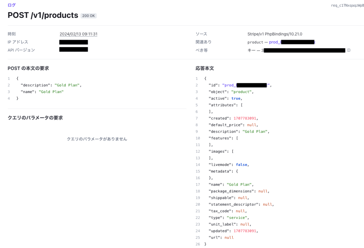 なお、応答は以下の通りとなり、Stripe 開発者画面からもLogを確認できます。
