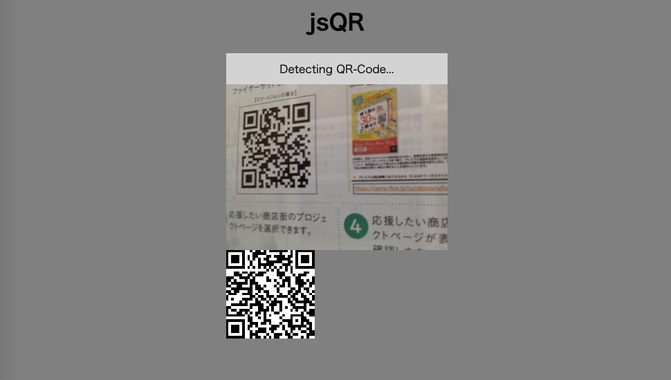 "jsQR"関数の実行結果が"null"でなければ、検出が成功している状態です。