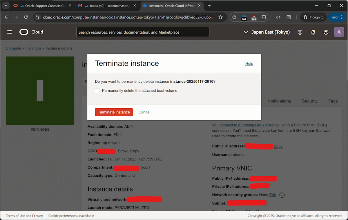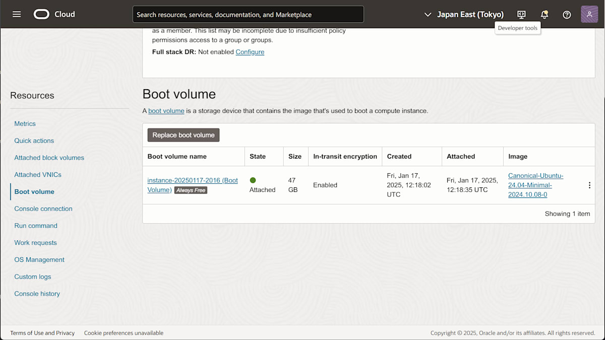 After that, Click on Console connection button right below the Boot volume one, and then Launch Cloud Shell connection. This should give you a console in the browser. After that, you can login via the username and password you specified in the cloud-init script!