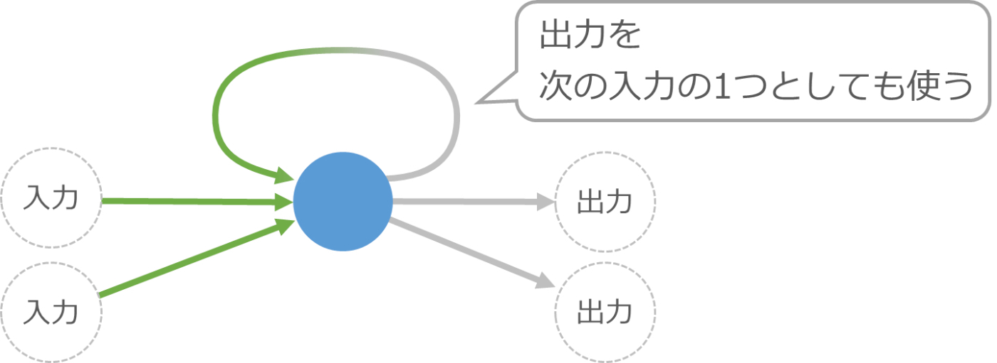 この図だけでは分かりにくいのですが、これで入力の順番を考慮した調整ができるようになります。たとえば、この細胞を使った仕組みに対して実際の小説のデータを機械学習させると、おもしろいことができるようになります。