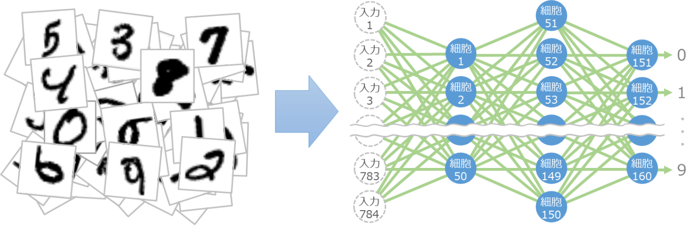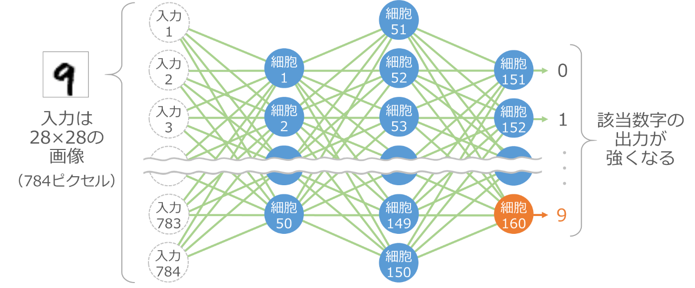 最後の10個の細胞は数字の 0 から 9 に対応しており、入力で渡した画像に対応する数字の細胞の出力が強くなる仕組みです。これにより、手書き数字の画像がどの数字なのかを認識できます。