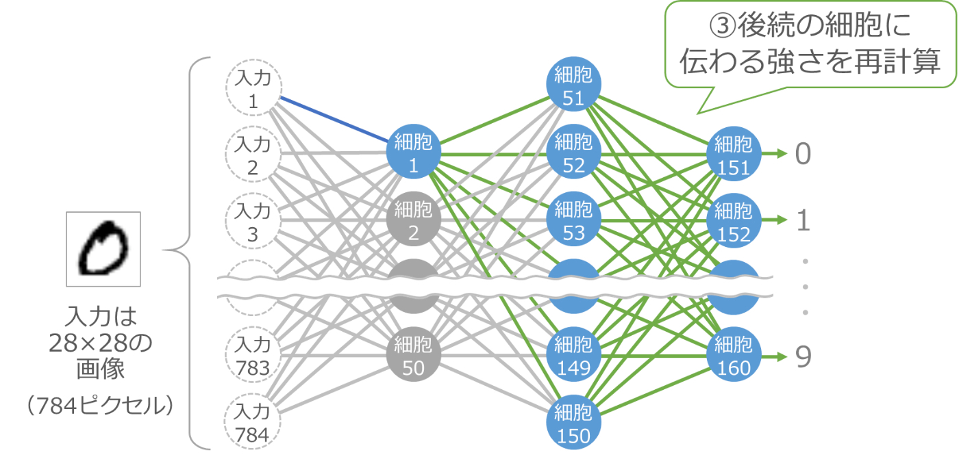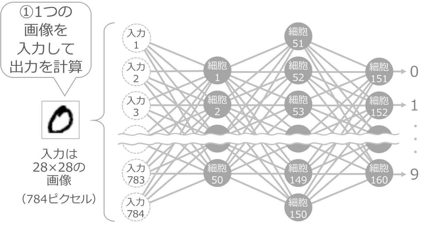 入力は 784個のデータで、縦横 28 ピクセルの画像データです。これを入力データとして、50個(細胞1から細胞50)の細胞の出力を計算します。次にこの50個の出力を入力として、次の100個(細胞51から細胞150)の出力を計算します。最後にこの100個の出力を入力として、最後の10個(細胞151から細胞160)の出力を計算します。