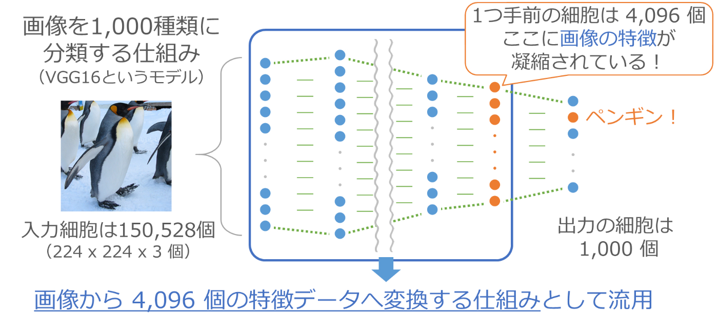 まず最初に、入力画像を流用した仕組みで4,096個の特徴データに変換します。この部分はすでに機械学習が済んでいるので調整作業は不要です。画像処理部分の機械学習を省くことができることも、この組み合わせの大きなメリットです。