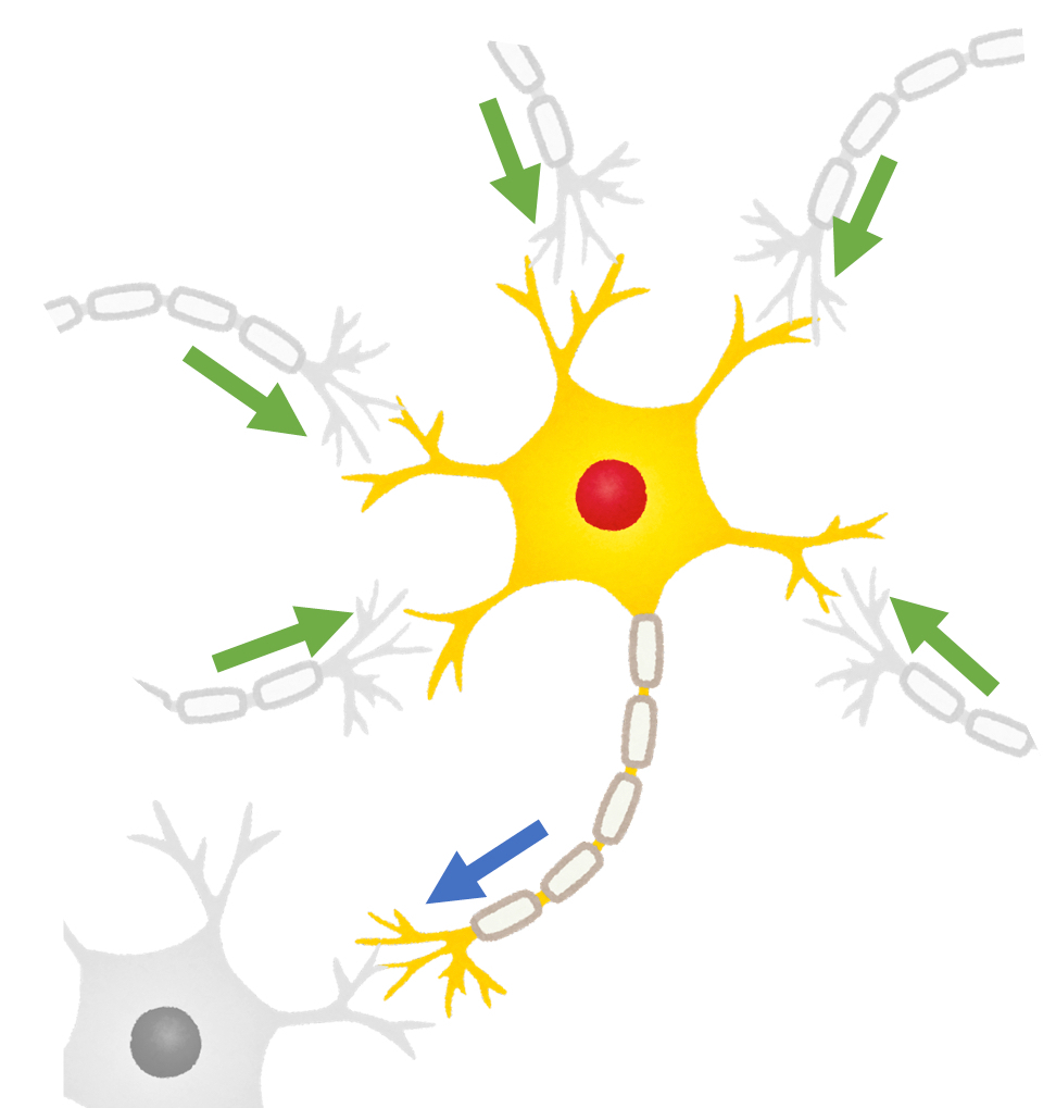 細胞は他の複数の細胞から信号を受け取ります。この図では、他の5つの細胞から緑の矢印の方向で信号を受け取っています。信号を受け取った細胞は、その強さの合計がある境界を越えると、次の細胞へ信号を伝えます。青い矢印がそれを示しています。