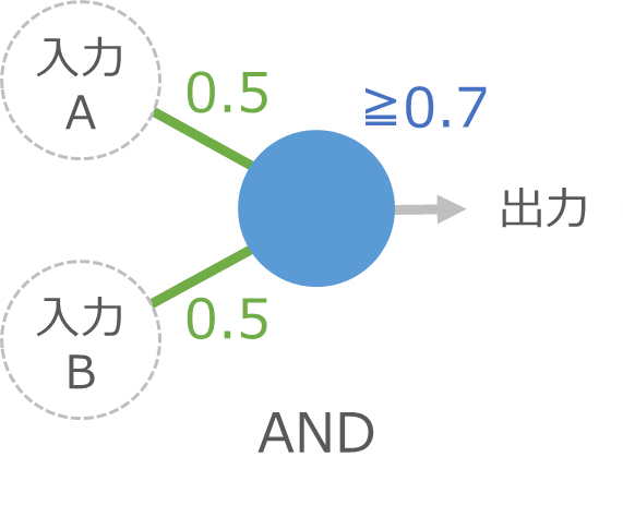 AND とは、両方の入力が 1 なら出力は 1 、それ以外は 0 という計算です。上の図で入力AとBが 1 の場合、青い細胞には 1×0.5+1×0.5 で合計 1 の信号が伝わり、境界の 0.7 以上なので出力が 1 になります。もし細胞Bが 0 の場合は、1×0.5+0×0.5 で合計 0.5 となり、境界に届かないので出力は 0 です。
