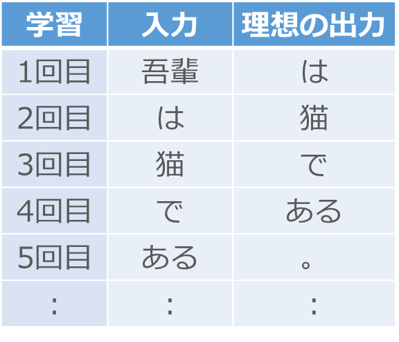 まず、入力に小説の先頭の単語を与えて、出力がその次の単語になるように調整します[2]。夏目漱石の「吾輩は猫である」の場合、まず「吾輩」を入力して出力が「は」になるように調整し、次に「は」を入力して出力が「猫」になるように調整していきます。