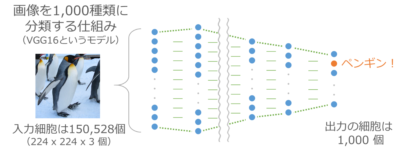画像を渡すと1,000種類(たとえば「ペンギン」、「消防車」、「オレンジ」、「電球」など)に分類するVGG16という仕組みがあります。縦横それぞれ224ピクセルのカラー画像を渡すと、その画像が1,000種類の中のどれなのかを識別し、何が写っているのかを教えてくれます。手書き数字の認識の発展版のような仕組みです。