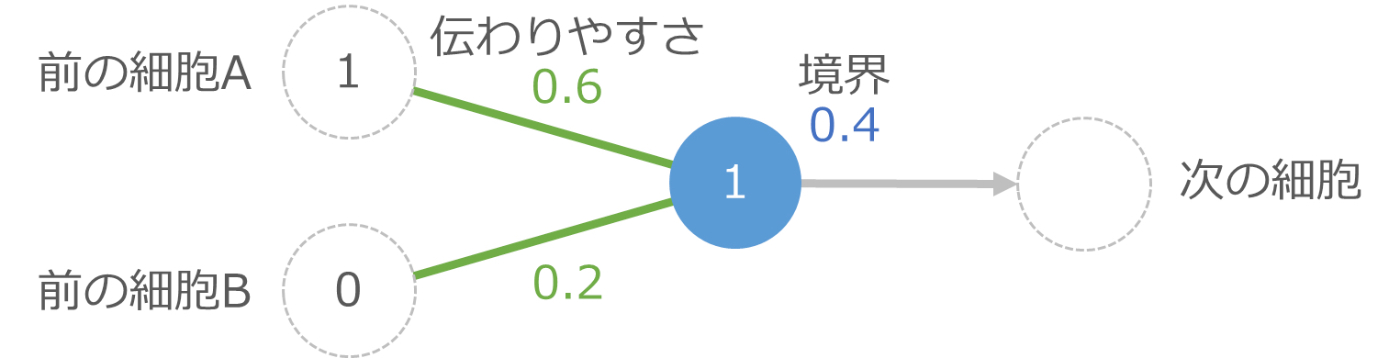 青い細胞は細胞Aから 0.6 、細胞Bから 0 の信号を受け取るので、信号の合計は 0.6 です。これは青い細胞の境界である 0.4 以上なので、次の細胞に強さ 1 の信号を伝えます。もし境界より小さい場合は次の細胞へは信号を伝えません。