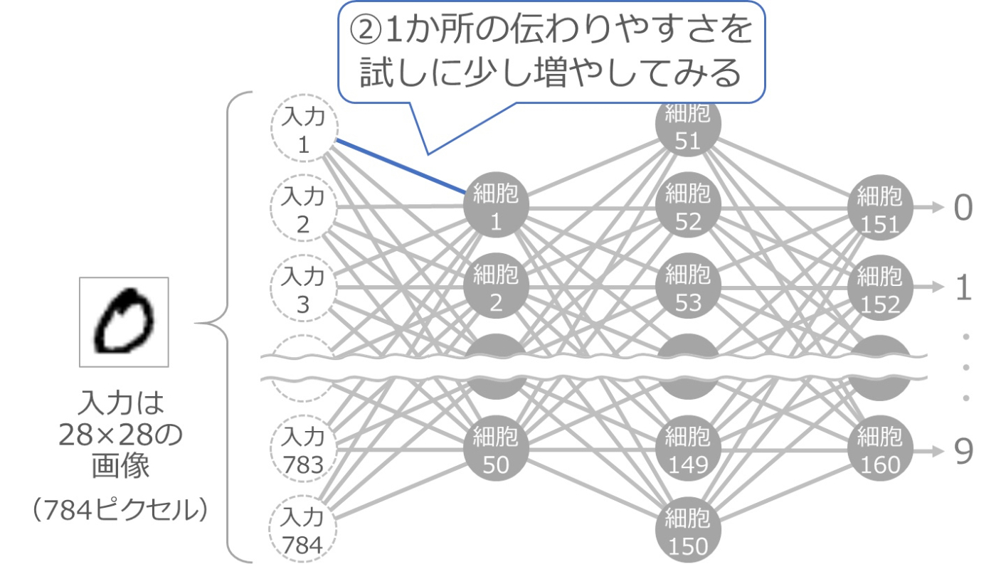 もし、細胞151の出力が最初に試した時より大きくなったり、他の細胞の出力が小さくなった場合は、入力1と細胞1をつなぐ線の伝わりやすさを大きくしたことが正解だったので、この変数の変更を確定します。そうではない場合は、この変数の変更は失敗だったので、逆に少し小さくすることで確定します。