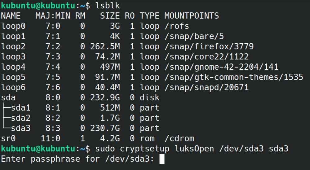 sudo cryptsetup luksOpen /dev/sda3 sda3