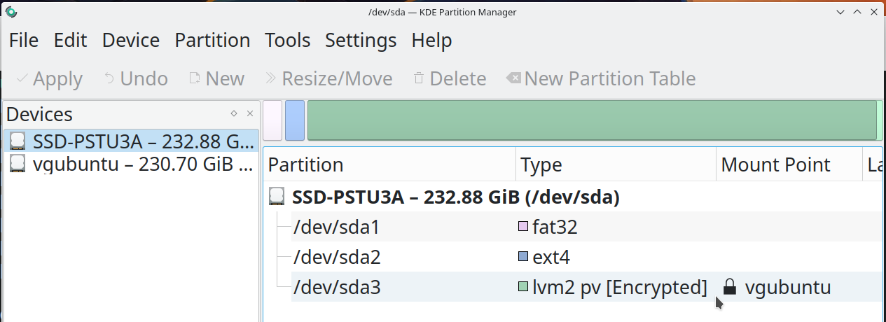 KDE Partition Managerの左側にはSSDやHDDのデバイス一覧が表示されます。一番上のSSDを選ぶと右側に詳細が表示されます。このデバイスは/dev/sdaとしてマウントされており、dev/sda3は暗号化パーティションであり、vgubuntuと名付けられていることがわかります。これは上での作業結果と整合しています。