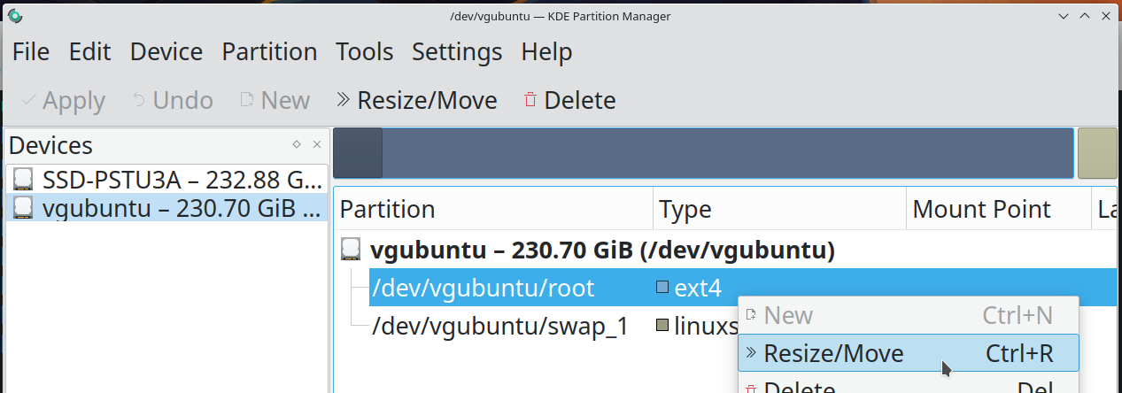 次に左側のデバイスからvgubuntuを選ぶと、先ほどの復号で現れたrootとswap_1が右側に現れます。これらはパーティションであり、右クリックして現れるメニューからResize/Moveすることができます。
