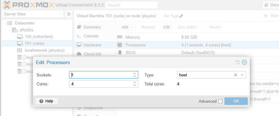 変更するにはProxmox VEのWEB管理画面でVMを選び、Hardware->Processors->Editをクリックして現れたダイアログのTypeを変更してください。