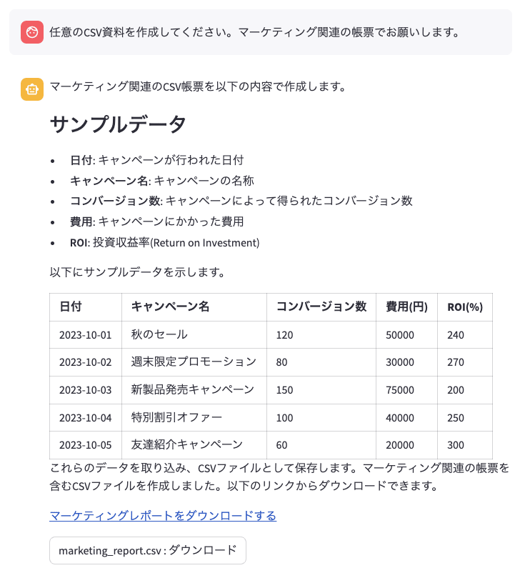 - 指示文:「任意のCSV資料を作成してください。マーケティング関連の帳票でお願いします。」