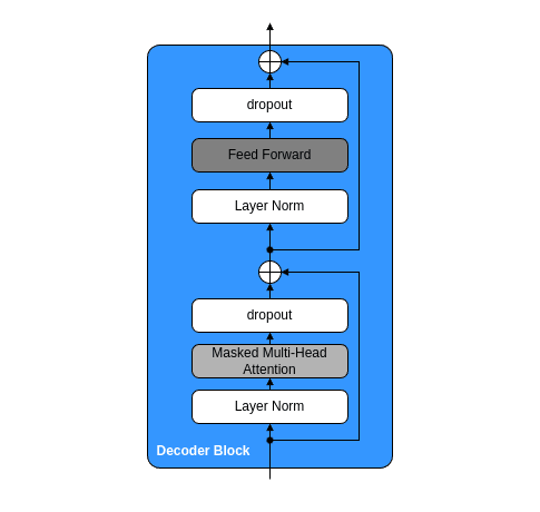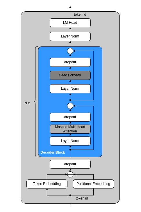 本記事で作成するGPT2モデルの構造は、次のとおりです。