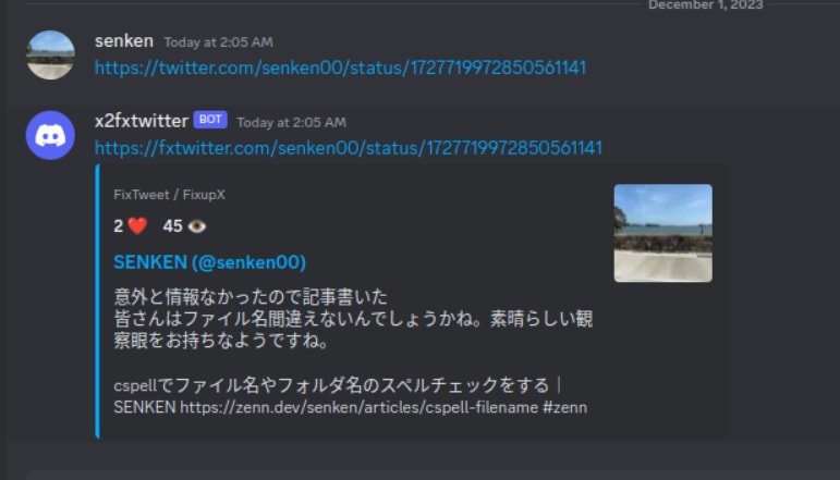 私は普段よく友達と Discord で会話してまして、X(Twitter)でのポストも度々共有することがあるのですが、2023/12/1 時点での仕様ではポストの中身のコンテンツが表示されなくなっています。