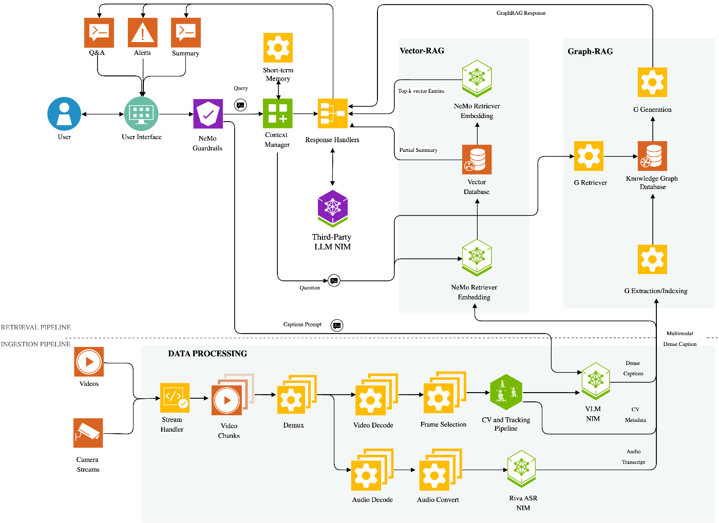 VSSのコア部分は CA-RAG(Context-Aware Retrieval Augmented Generation) と呼ばれ、VLMで生成されたキャプションを基に動画の検索と要約を実現します[2]。CA-RAGは以下の2つのパイプラインで構成されています。