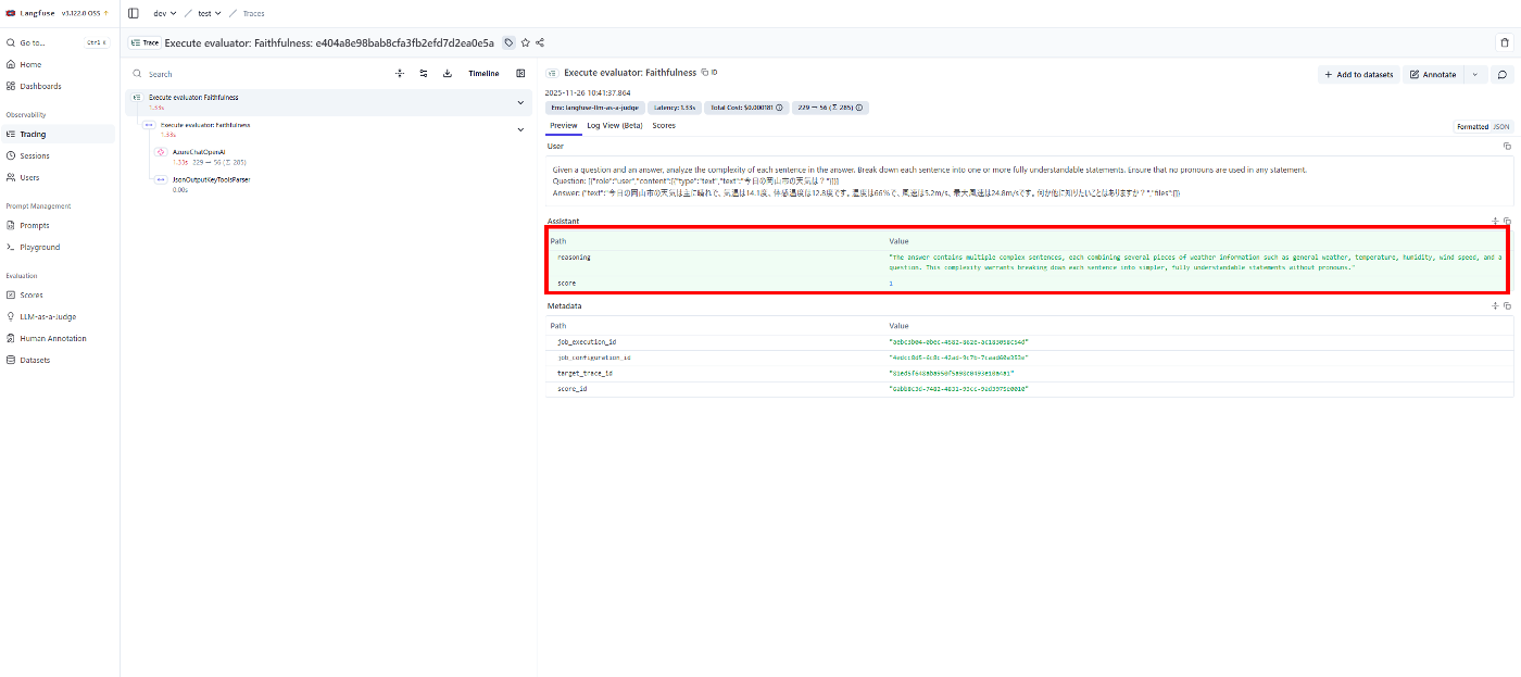 評価結果が赤枠内となります。「回答には、一般的な天気、気温、湿度、風速などの複数の気象情報と質問を組み合わせた複数の複雑な文が含まれています。この複雑さにより、各文を代名詞を使わずに、より単純で完全に理解可能なステートメントに分割することが正当化されます」という評価結果が表示されています。また、scoreは1(出典に対する回答の忠実性がある)となっていました。scoreが0の場合は回答に事実誤認があると判定されています。