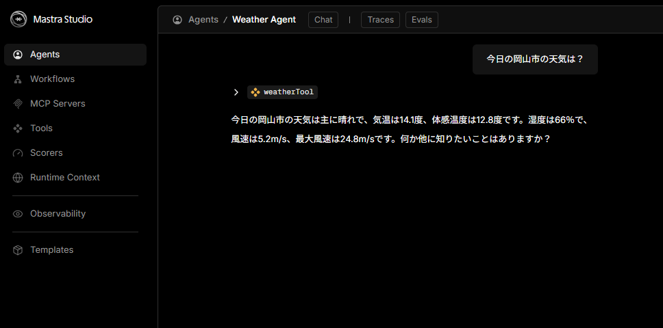 | 主要ライブラリ | "@ai-sdk/azure": "^2.0.70", "@mastra/core": "^0.24.1", "@mastra/evals": "^0.14.4", "@mastra/langfuse": "^0.2.3", "@mastra/libsql": "^0.16.2", "@mastra/loggers": "^0.10.19", "@mastra/memory": "^0.15.11", "zod": "^3.25.76" |