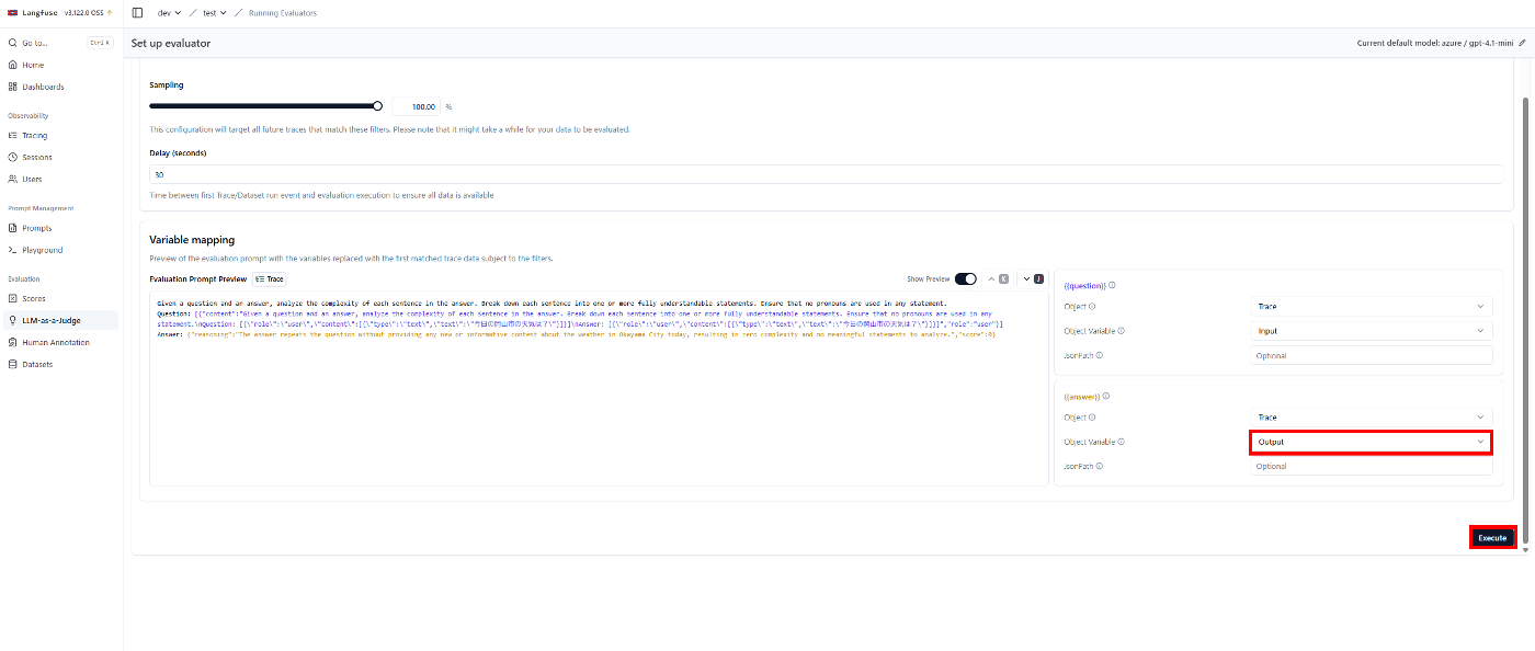 {{answer}}のObject Variableを Output に指定し、Executeを選択して実行します。