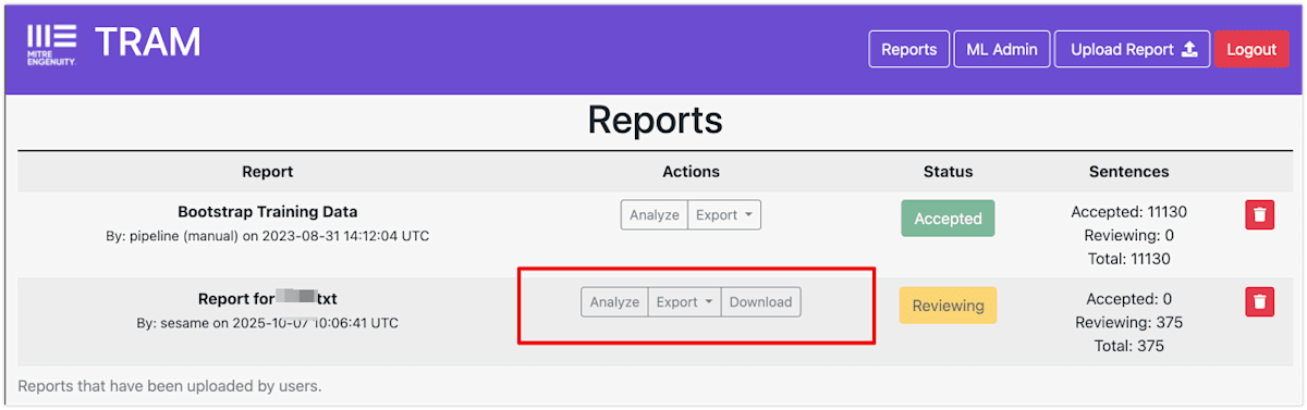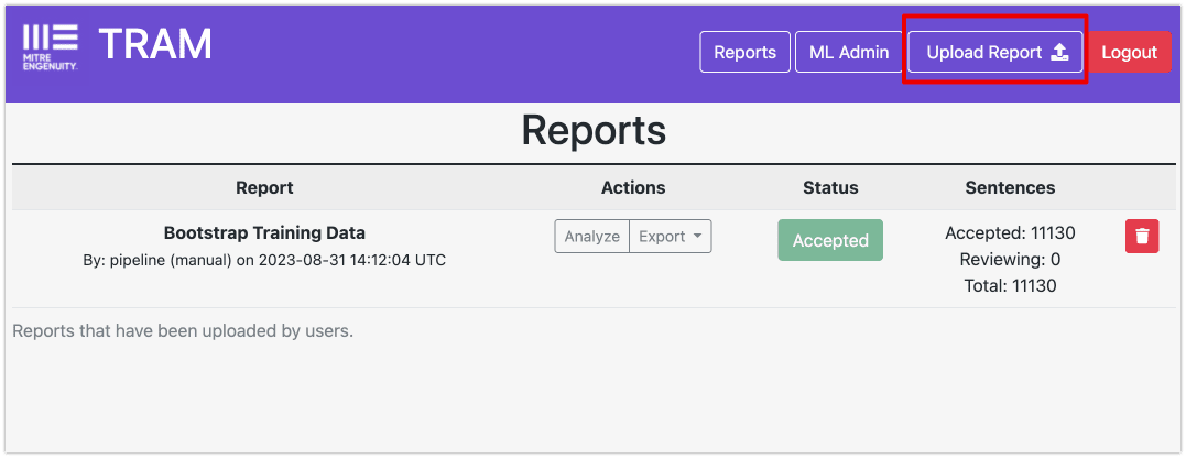 - TRAM UIにてUpload Reportボタンを押し、入手したレポートをアップロードします。