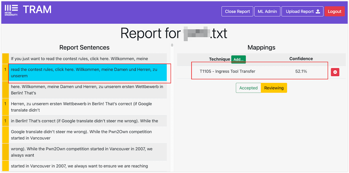 TRAMはサイバー脅威インテリジェンス(CTI)レポート(英語のみ)の内容から、レポートに記載されている攻撃者のTTP(戦術、手法、手順)を自動的に見つけだします。