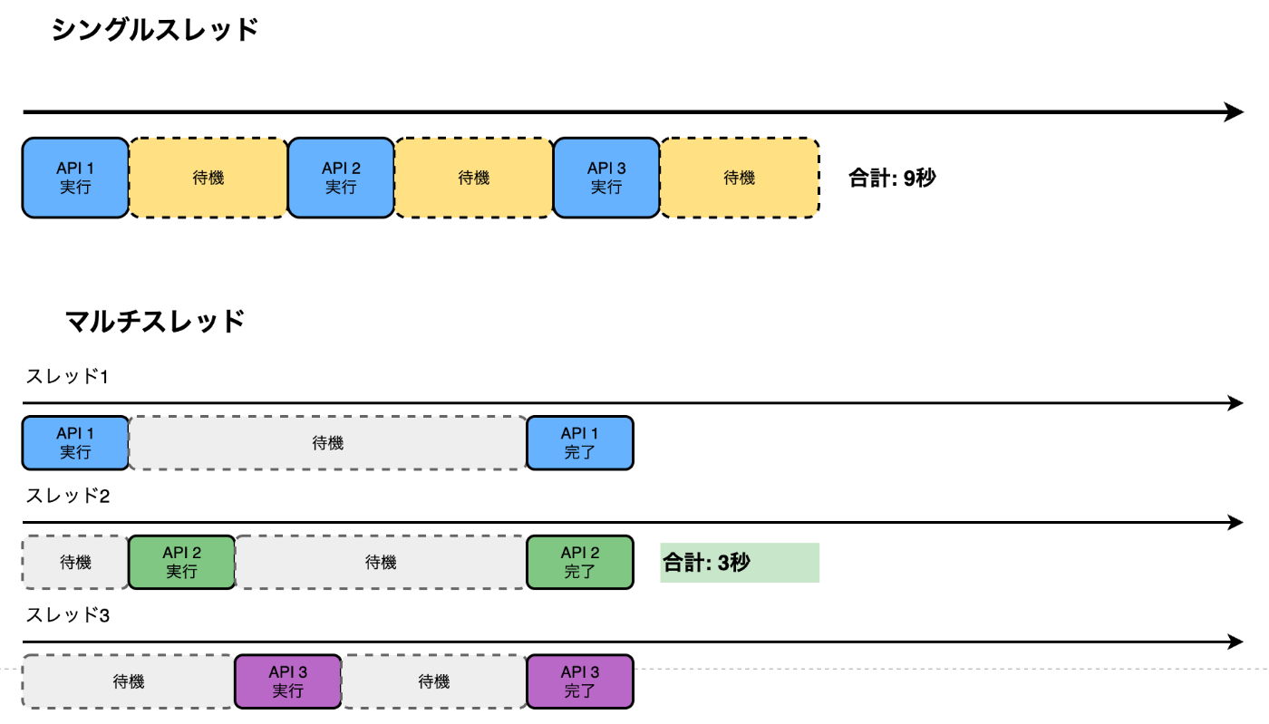 - スレッド1: API 1実行 → 待機(この間スレッド2,3が実行) → API 1完了