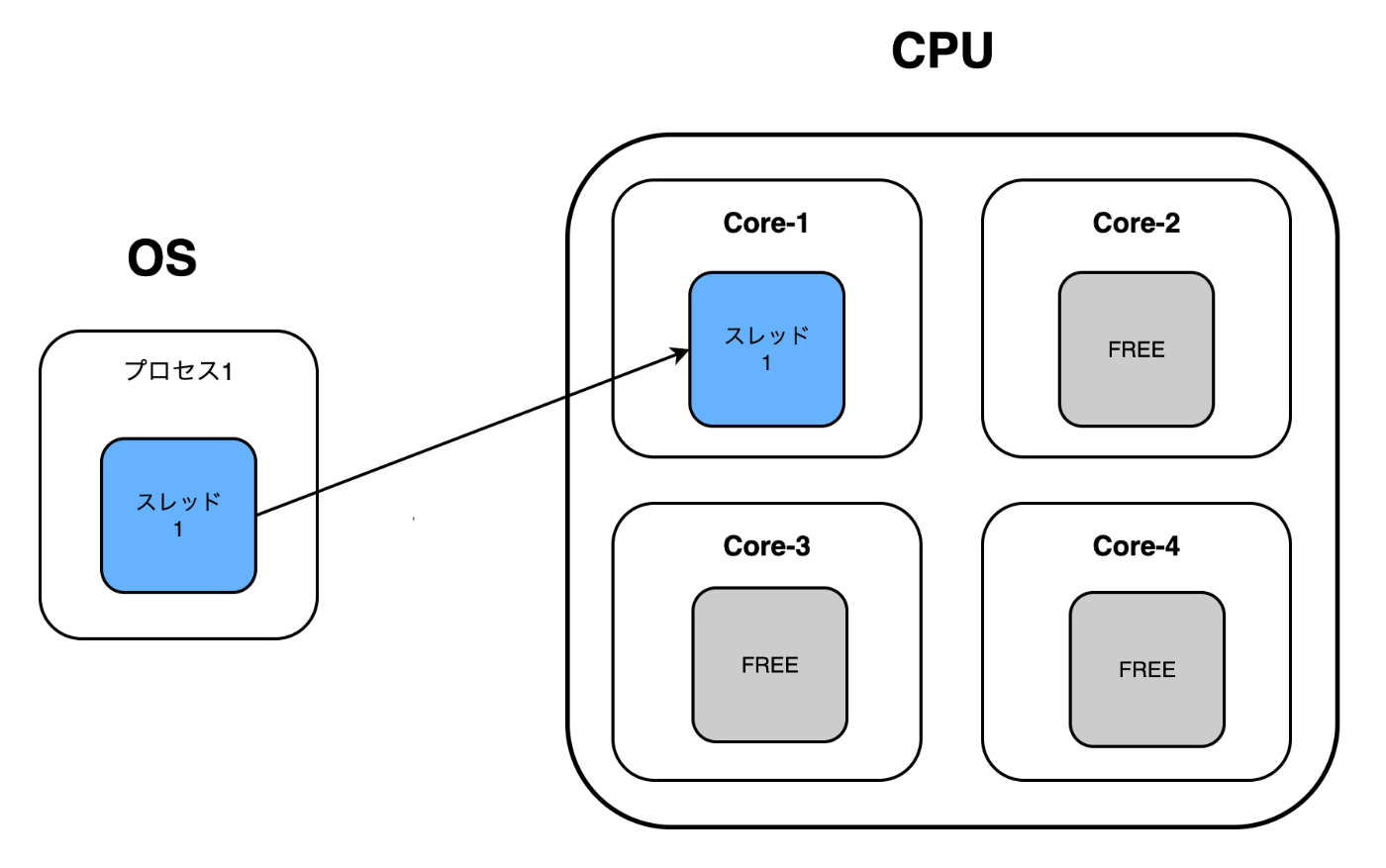 プロセス内の実行単位です。同一プロセス内のメモリを共有するため、スレッド間の通信は高速です。ただし、瞬間的には1コアだけを使用し、時間経過で別のコアに移動可能です。