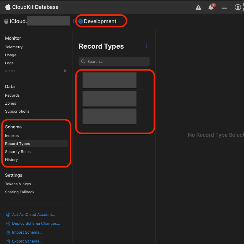 - Environment が Development であることを確認し、Schema の Record Types にレコードがあるか確認する(SwiftDataで定義したものが出ている確認する)。
