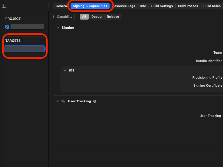 - Xcodeの 「TARGET」 → 「Signing & Capabilities」 へ移動
