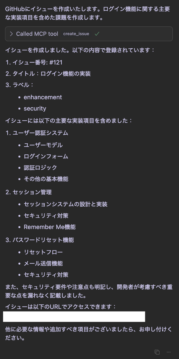 このように指示するだけで、GitHub に詳細なイシューが作成されます。