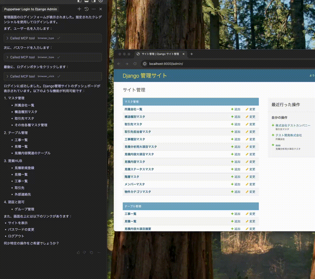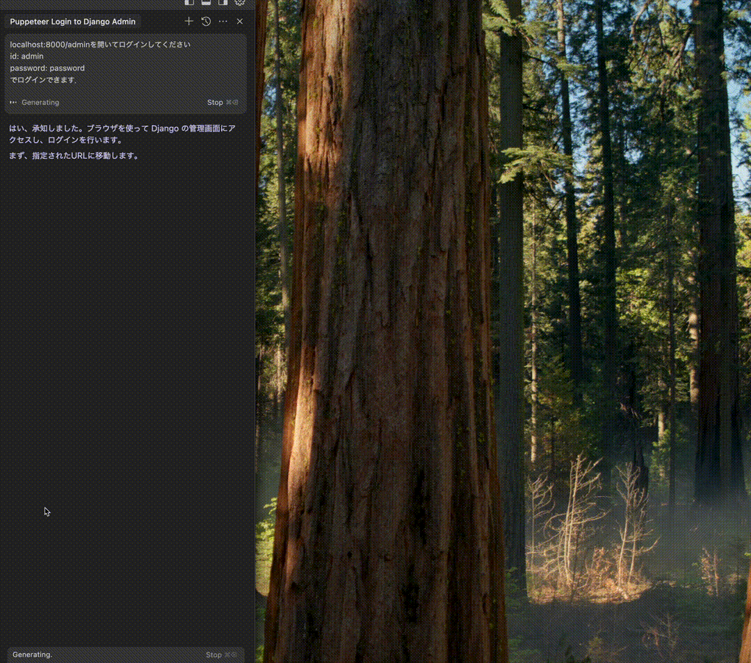 自然言語による指示によって、ローカル環境でログイン処理を行う様子