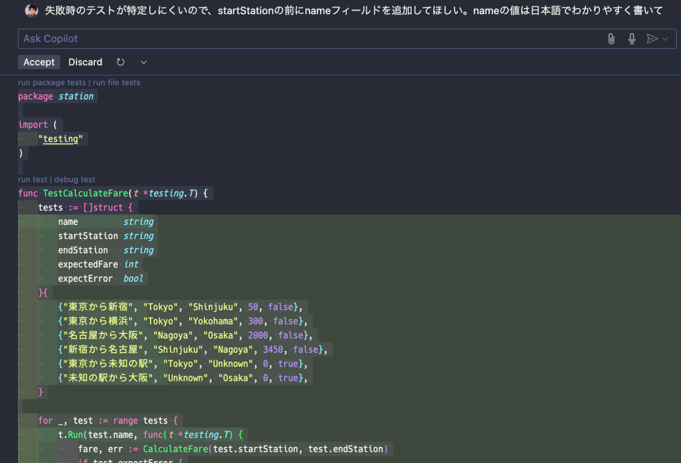 失敗時のテストが特定しにくいので、startStationの前にnameフィールドを追加してほしい。nameの値は日本語でわかりやすく書いてと、インラインで指示するといい感じに修正してくれました。