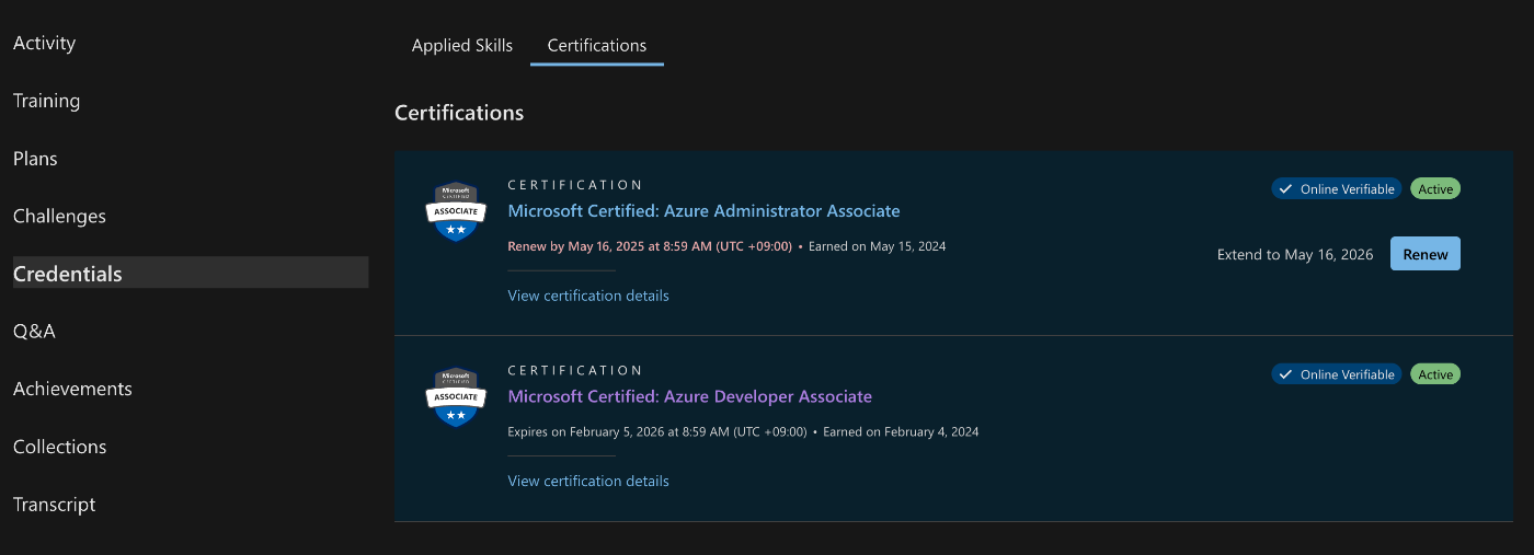 Microsoft learnのマイページのCredentialsに行くと、更新試験受験可能な資格にRenewボタンが出ています。