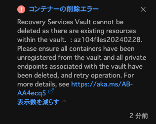 しかし、バックアップアイテムを削除するだけではRecovery Services コンテナを削除できませんでした。