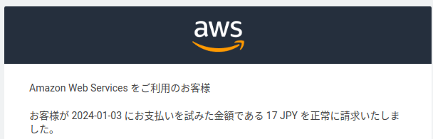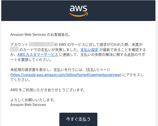 アカウント xxxx の AWS のサービスに対して請求が行われた際、末尾が xxxx のカードでの支払いが失敗しました。支払い設定 が最新であることを確認するか、AWS カスタマーサービス に連絡して、支払いの失敗の解決に関する追加のサポートを要請してください。