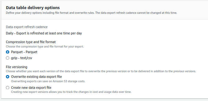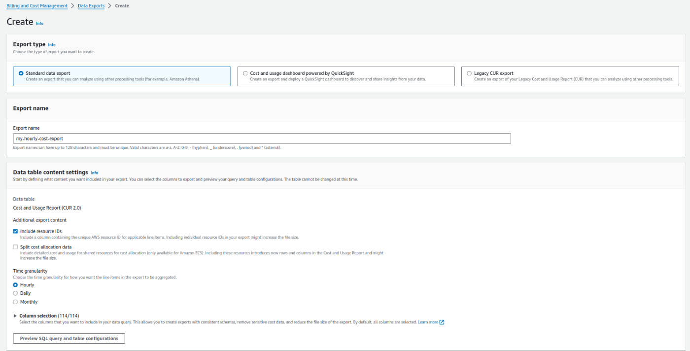 Data Exports enables you to create exports of the Cost and Usage Report (CUR) 2.0. You can still create and view your Legacy CUR exports in this console or in the Legacy console here . Click Create to start creating customized exports with only the data you want and to control the schema of your exports. You can also create an export that deploys a dashboard in QuickSight.