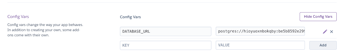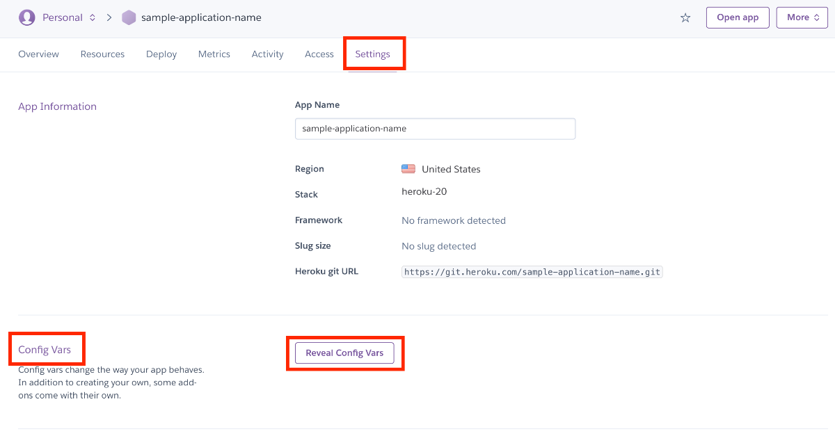 ダッシュボードの「Settings」タブに移動し、「Config Vars」の「Reveal Config Vars」をクリックします。
