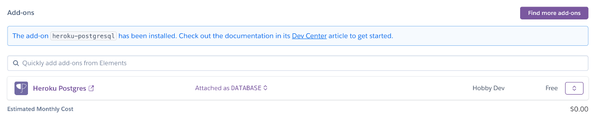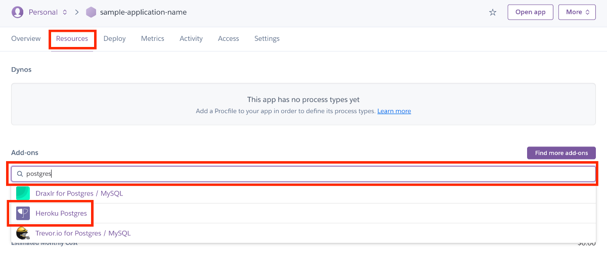 ダッシュボードの「Resources」タブに移動して、「Add-ons」の入力フォームに「postgre」と入力すると「Heroku Postgres」が出てきますのでクリックします。