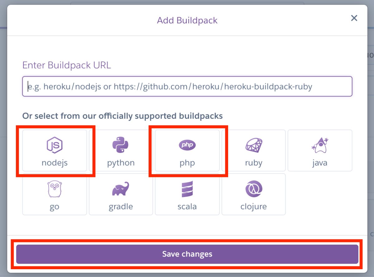 このようなモーダルが出てくるので「php」と「node.js」をそれぞれ選択して「Save changes」をクリックして追加します。