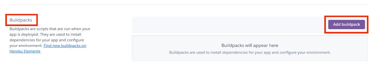 ダッシュボードのタブは「Settings」のままで、「Buildpacks」の「Add buildpacks」をクリックします。