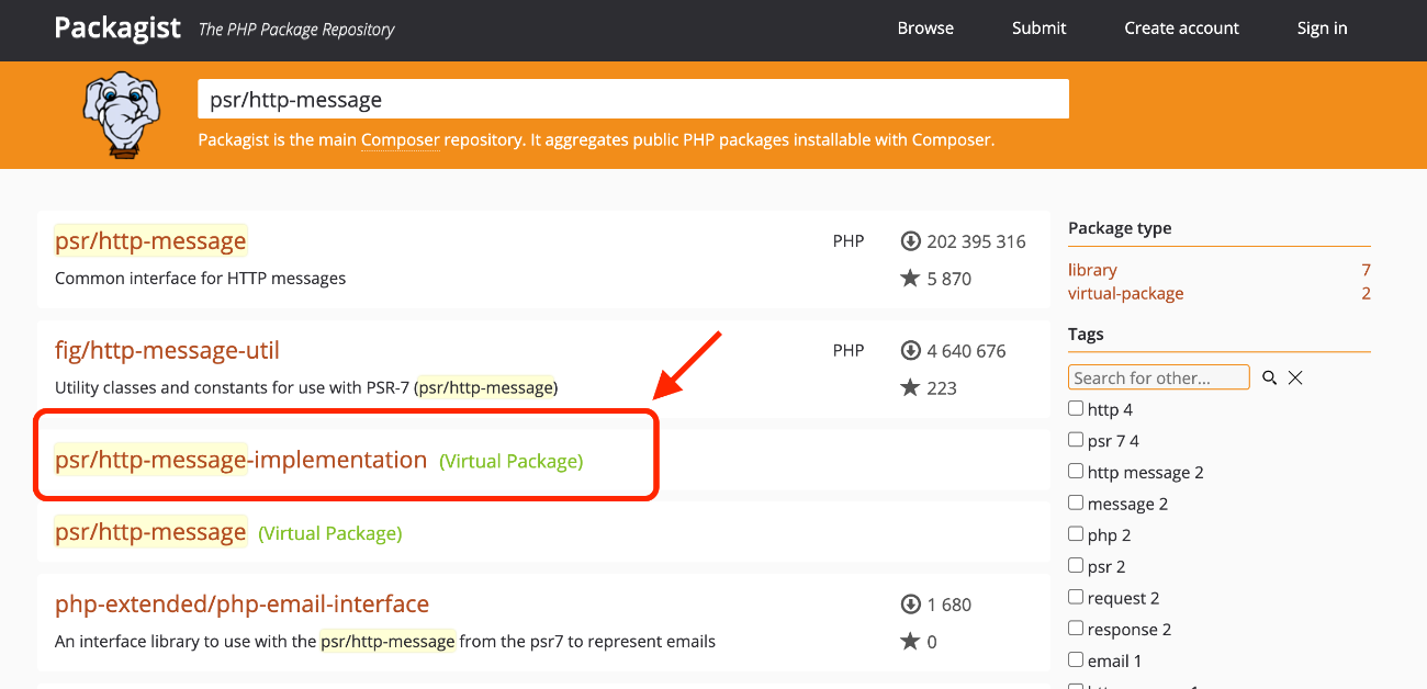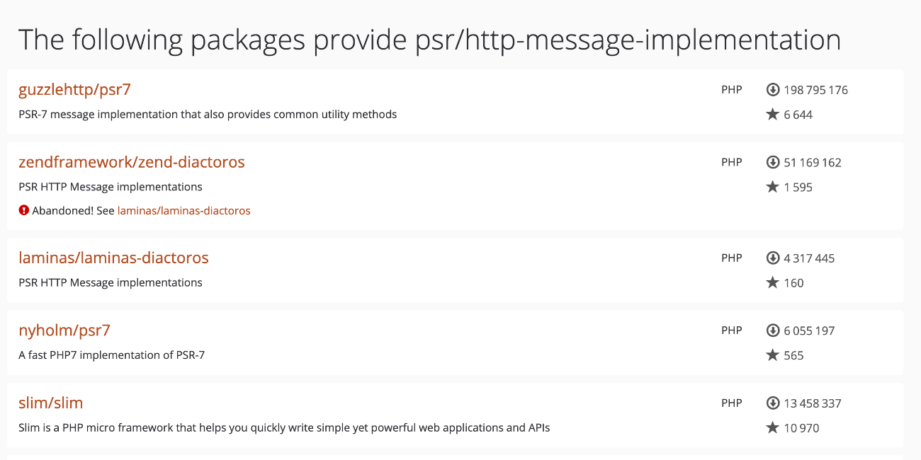 例えば、PSR-7 の psr/http-message を実装したパッケージを探すなら、psr/http-message で検索する。