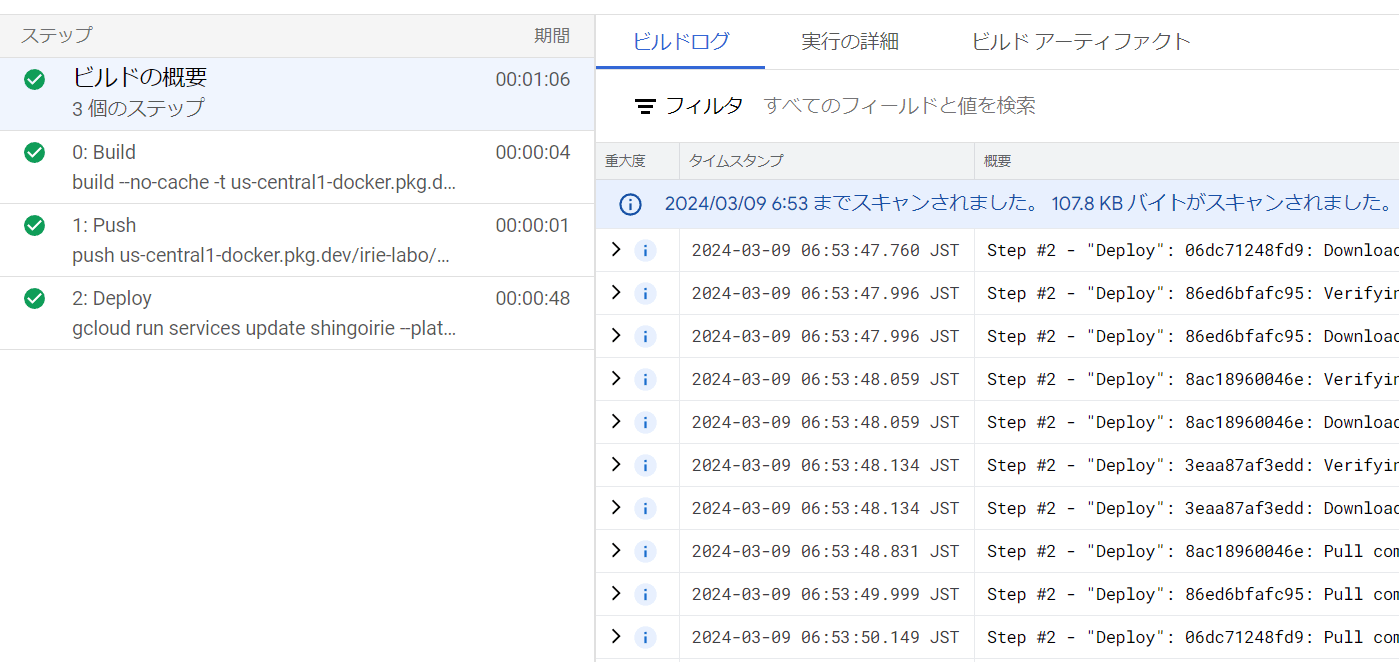 あとは、今回githubリポジトリにトリガーを設定しているため、mainブランチにデプロイするとcloud buildがはじまります。