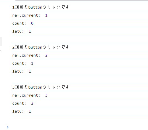 console.log(`${ref.current}回目のbuttonクリックです`);