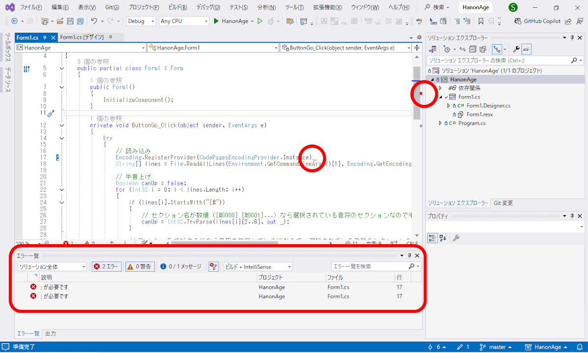 例えば上の写真では「; が必要です」というエラーメッセージで、行の末尾のセミコロン ; がないため、行の末尾に赤い波線が引かれています。セミコロンを入力すればビルドできるようになります。