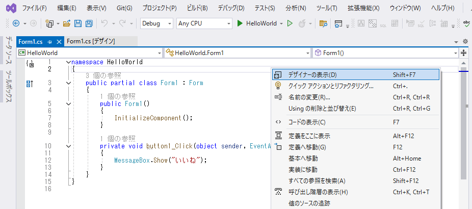 右側ソリューションエクスプローラーパネルの Form1.cs をダブルクリックするとデザインタブが開きます。