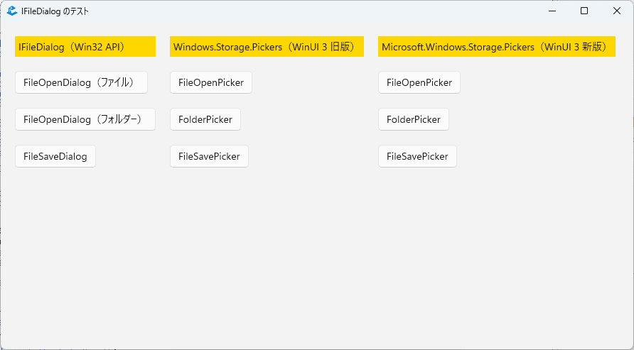 ただ、WinUI 3 のダイアログは他と比べて機能が少ないため(例:フィルターインデックスを指定できない)、フル機能を使いたい場合は Win32 API を使う必要があります。
