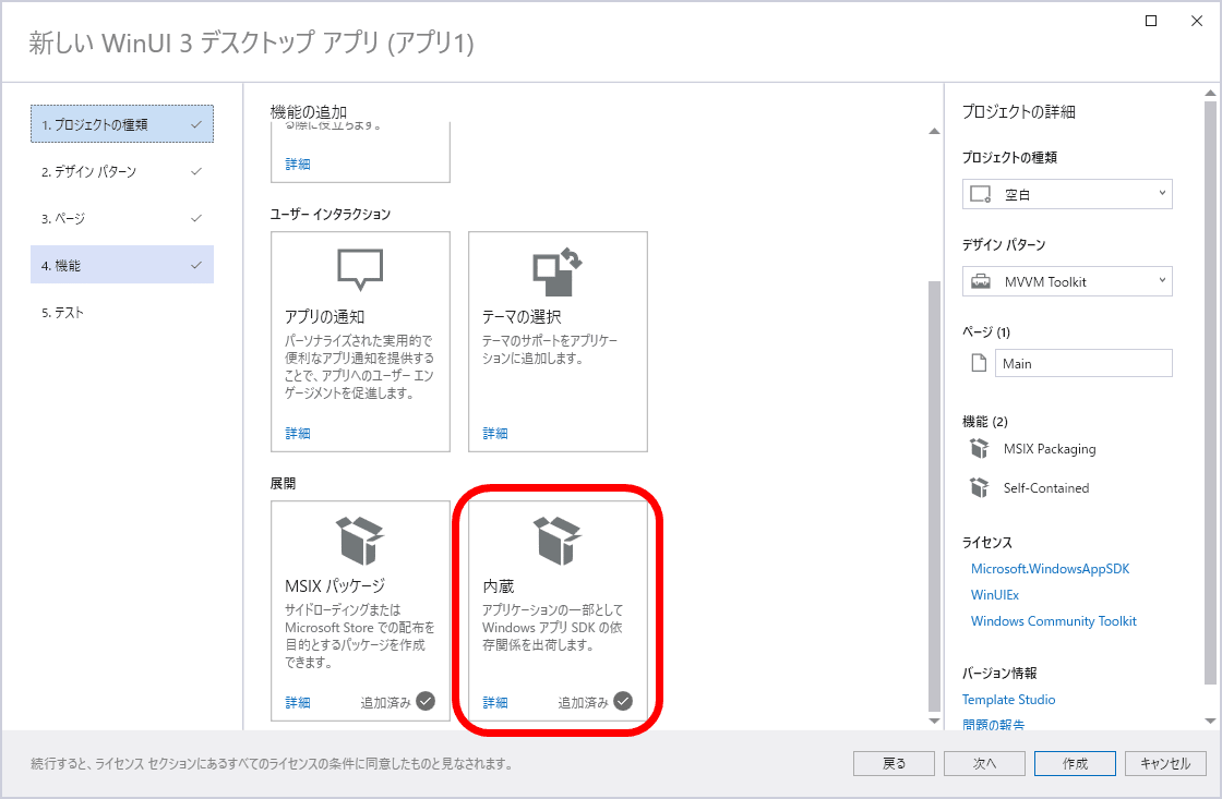 なお、デフォルトで選択されている「MSIX パッケージ」は選択されたままにしておきます。