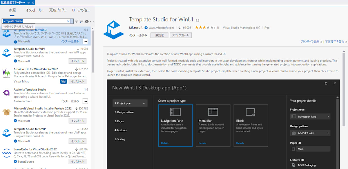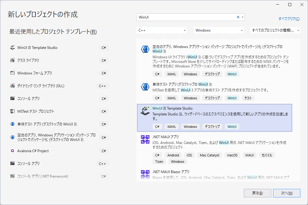 新規プロジェクト作成時、「WinUI の Template Studio」テンプレートで作成します。