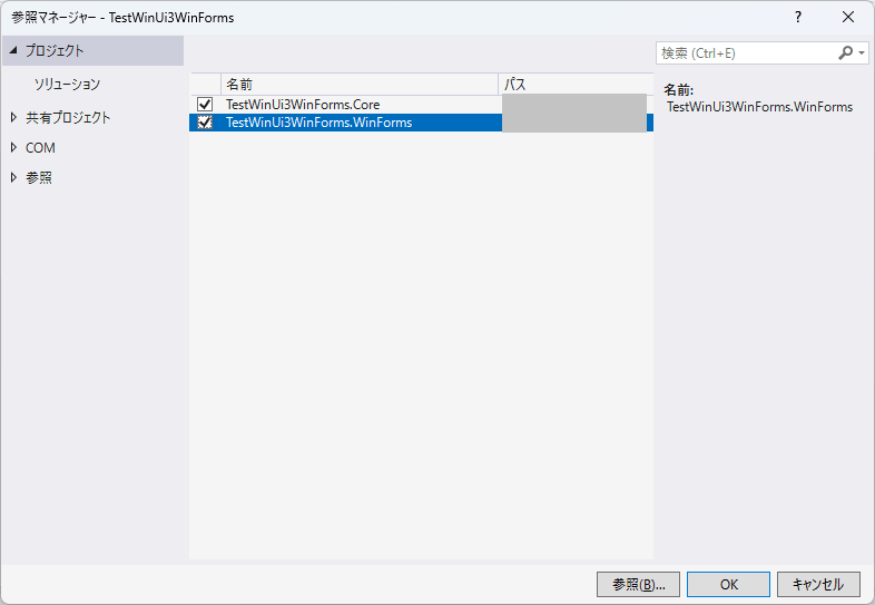 参照マネージャーで TestWinUi3WinForms.WinForms プロジェクトを追加します。